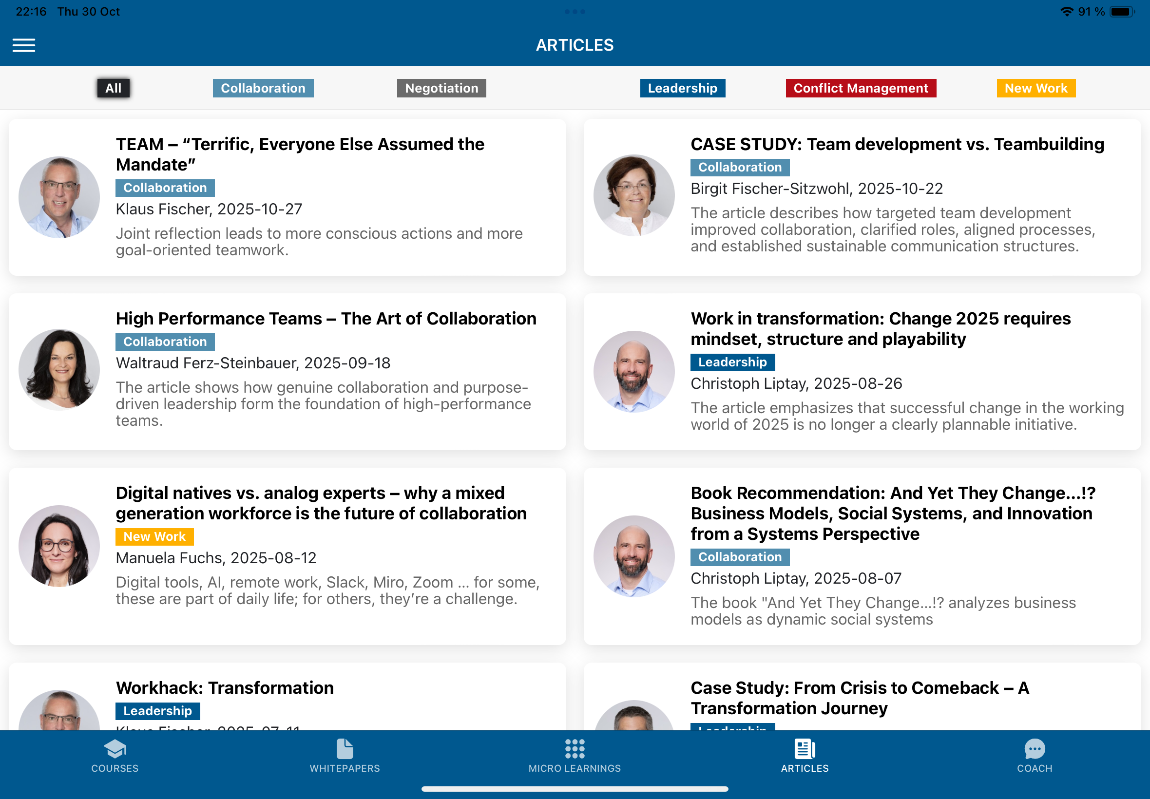 In the Articles section, you’ll find short insights from our consultants on current leadership and collaboration topics.