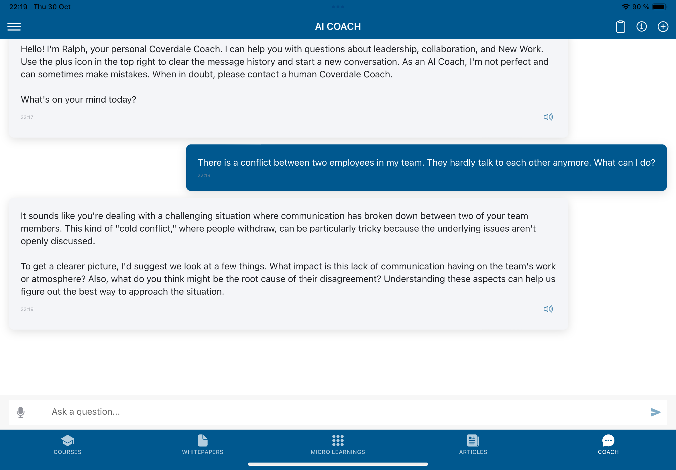 In the Coach section, you’ll find our Coverdale AI Coach — your digital sparring partner for questions about leadership, collaboration, and new ways of working.