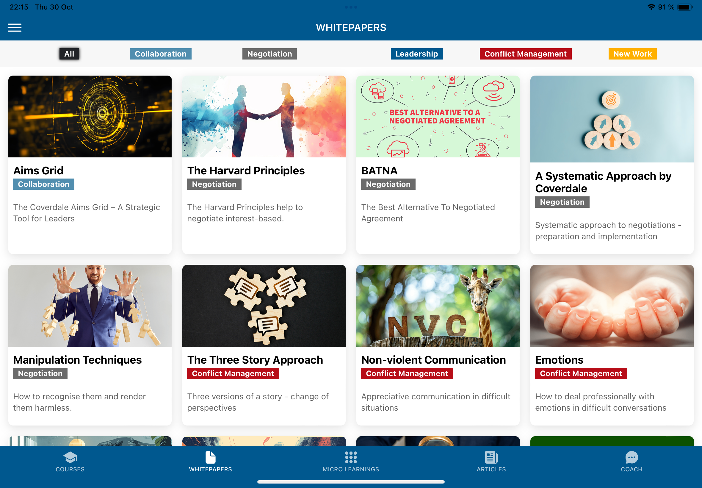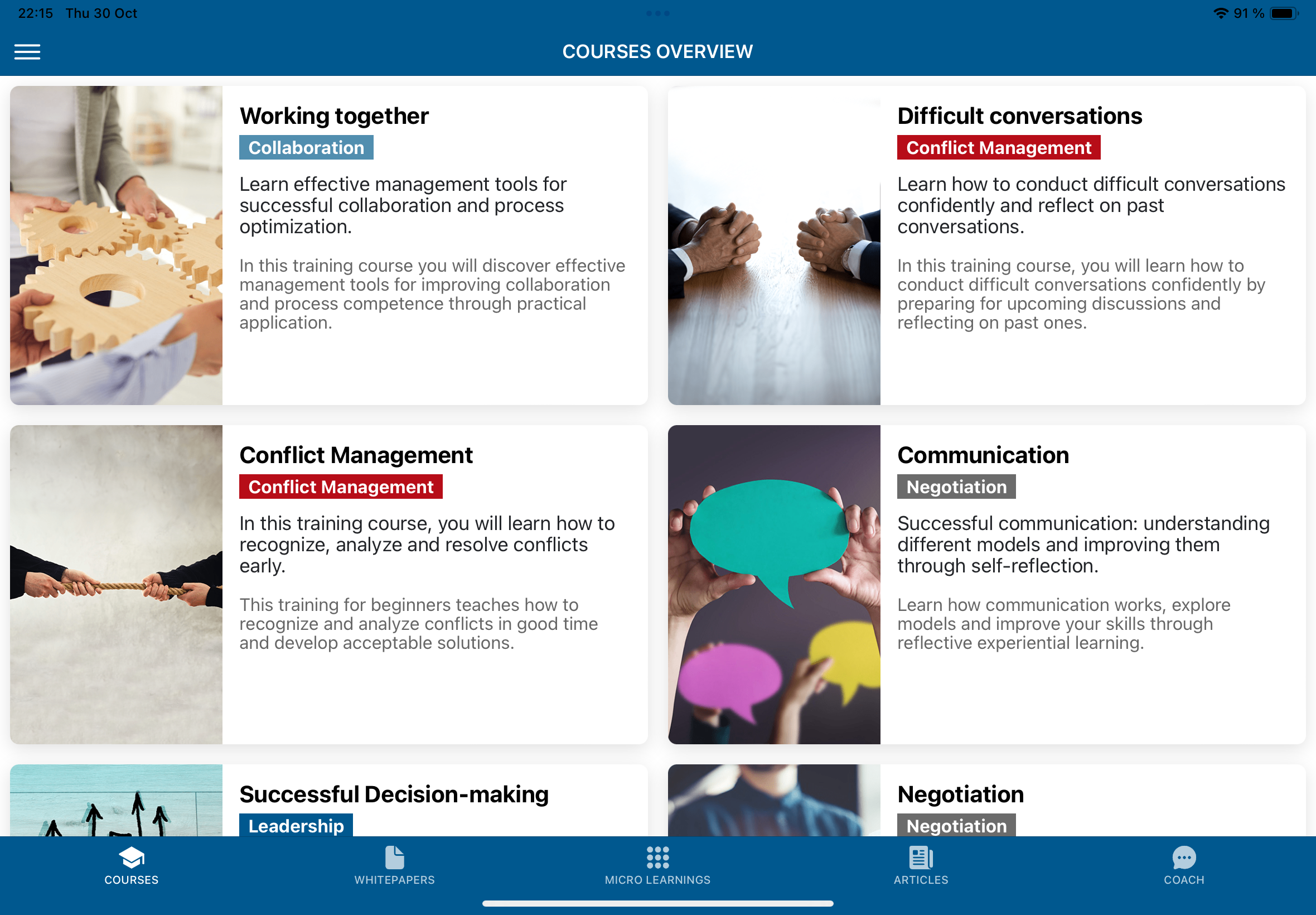 The Micro Learnings section features short video clips on topics such as collaboration, negotiation, leadership, conflict management, and new ways of working.